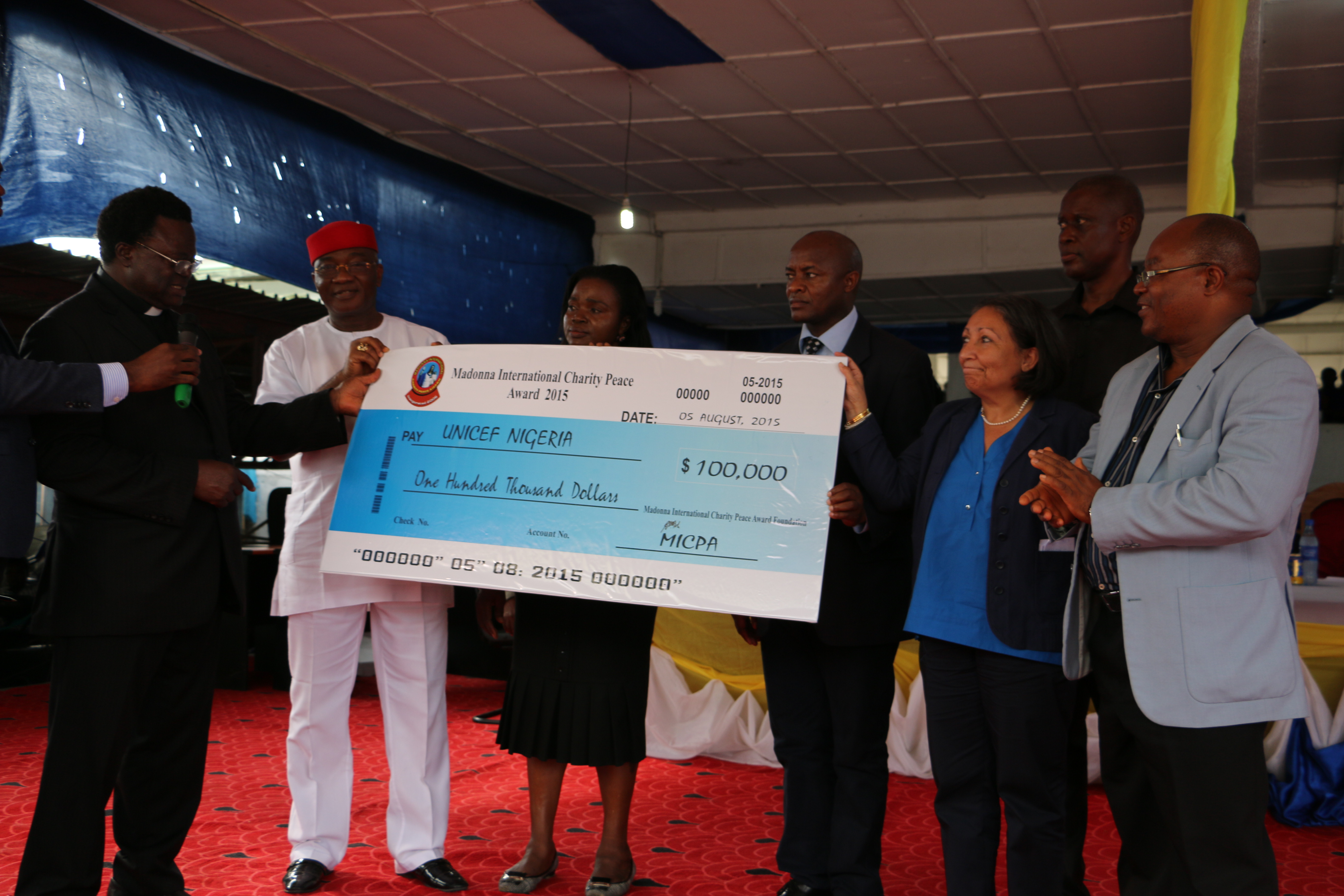UNICEF Country Representative visit to Peace Centre Elele UNICEF Country Representative, Jean Gough with Fr. EdehUNICEF Delegates recieving a donation of $100,000 from MICPAUNICEF Nigeria delegate at the Paint Factory (for skill acquisition) in Peace Centre EleleUNICEF Country Representative with the cheque donation from MICPAUNICEF Country Representative at Peace CentreUNICEF Country Representatives at Peace Centre Water Factory